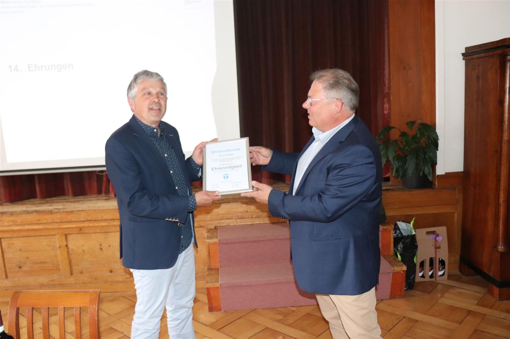 Der scheidende Präsident Urs Weder, wird, nach 22-jährigem Vorsitz, mit einem kräftigen Applaus zum Ehrenmitglied des Verbandes ernannt.